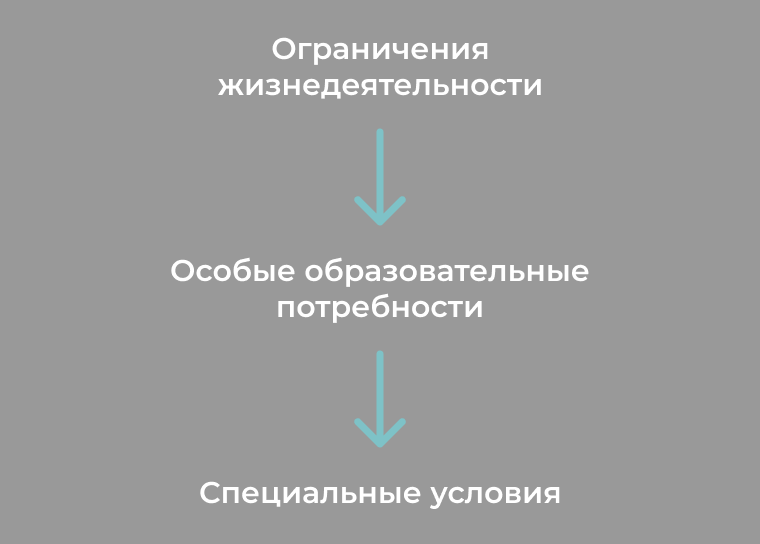 Продолжим нашу логическую цепочку: ограничения жизнедеятельности ребенка диктуют наличие особых образовательных потребностей. Особые образовательные потребности, в свою очередь, требуют создания комфортных условий для обучения.