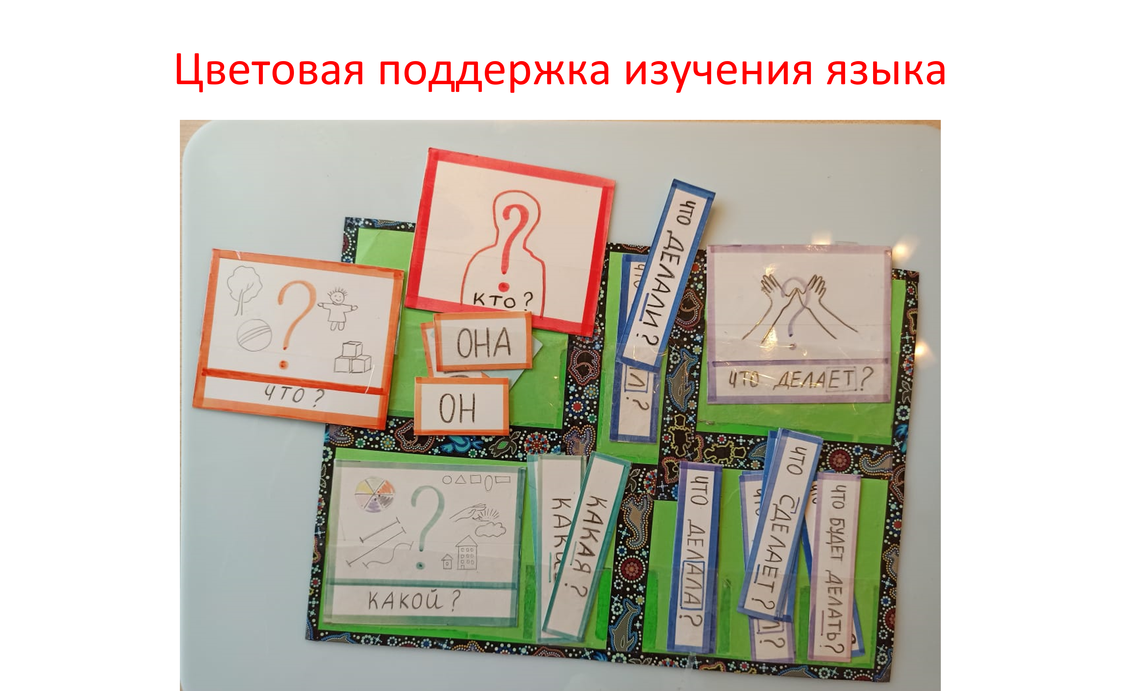 Например, для оценивания продвижения в родном языке – хорошо использовать цветовую поддержку частей речи и связей в предложении.
